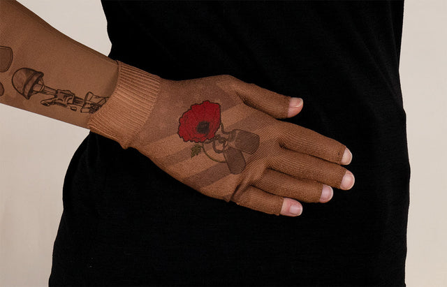 The LympheDIVAs Remember Mocha Gradient Compression Glove offers comforting, medical-grade support for effective hand lymphedema management with a rich, heartfelt design. Featuring warm mocha tones accented by a delicate red poppy motif, the Remember pattern is a meaningful tribute symbolizing remembrance, strength, and resilience. This compression glove provides consistent, therapeutic compression to help reduce swelling while remaining breathable and comfortable for everyday wear. Available in Class 1 (20–30 mmHg) and Class 2 (30–40 mmHg), it’s an ideal medical compression glove for patients seeking warmth, purpose, and gentle support.
